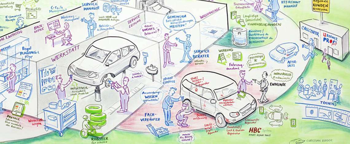 Hier finden Sie alles über Graphic Recording: Berlin, deutschlandweit & international allgemein oder hier konkret über Graphic Recording für die Automobilindustrie.