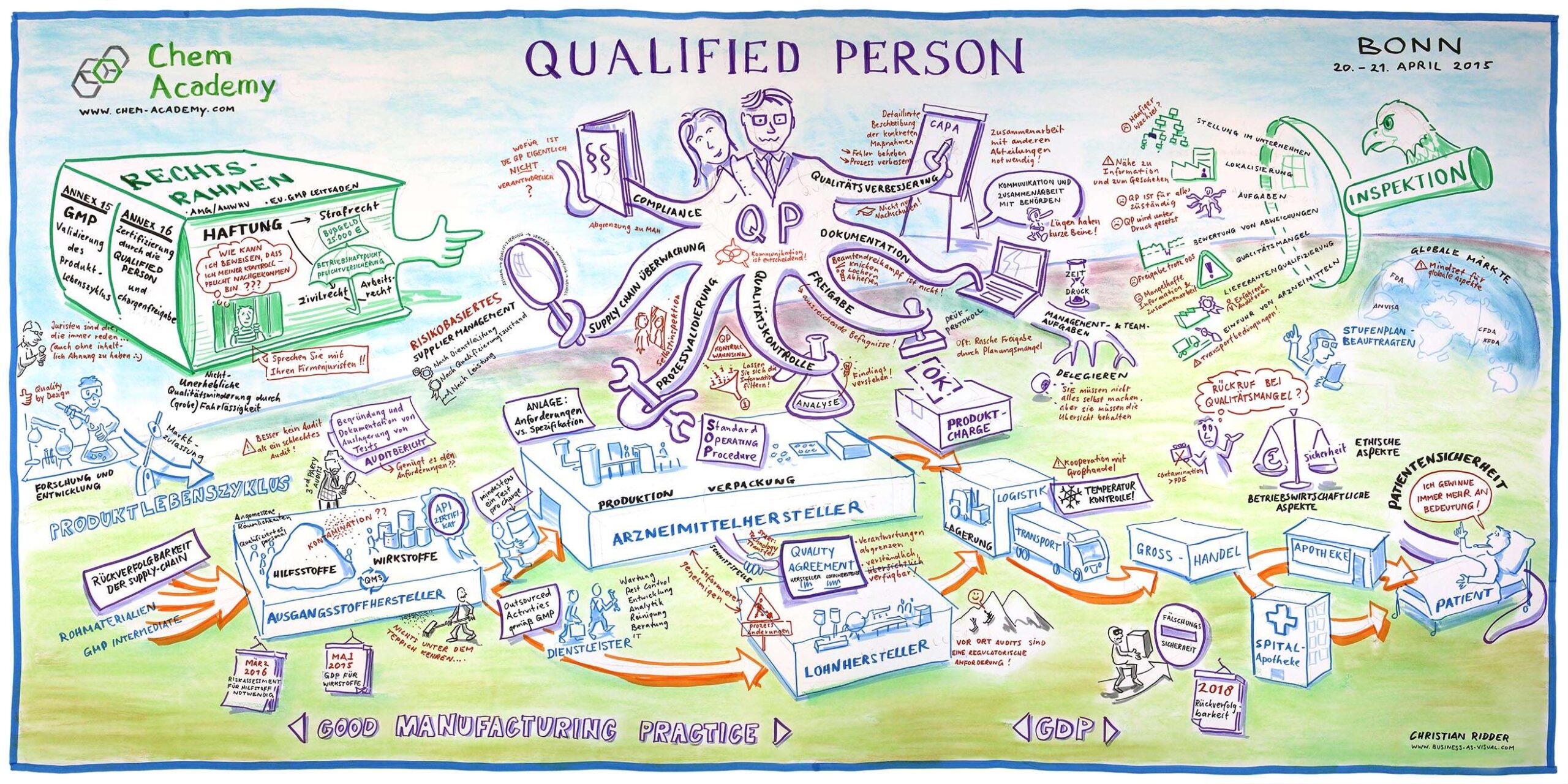 Die Informationen aus den Vorträgen und Q&A-Sessions wurden auf einem großen Bild festgehalten. Eine „mehrarmige“ Figur zeigt die Tätigkeitsfelder des QPs. Von der Prozessvalidierung, Produktfreigabe, Lieferantenaudit und Dokumentation bis zur Kommunikation mit den Behörden.